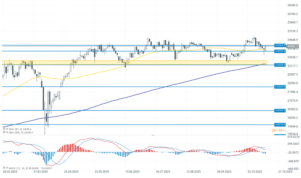 El Dax 40 sube un 1,5% para superar los 24.200 puntos. Las pérdidas del viernes se han recuperado por completo, formando una larga mecha inferior que, junto con la vela alcista de hoy, indica una fuerte demanda y la posible continuación de la tendencia alcista. El soporte más cercano para los alcistas se encuentra justo por debajo de los 24.000 puntos.