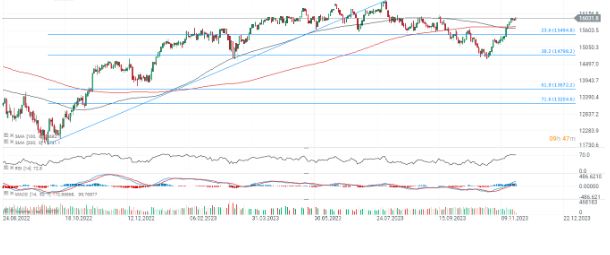 La sesión del martes en los mercados europeos transcurre con un ambiente mixto. El mercado se centra en el mercado del petróleo, donde hoy vemos intensas caídas en el precio del "oro negro", lo que según algunos analistas puede indicar preocupaciones potencialmente inminentes en torno a la demanda (recesión). Por otro lado, sin embargo, los precios más bajos del petróleo parecen favorables para la dinámica de la inflación, y los inversores también en la sesión europea esperan la apertura de la sesión estadounidense, donde Nvidia (NVDA.US) presentó resultados mixtos. Estos resultados del tercer trimestre del año fueron inferiores a los esperados. El DAX logró superar la barrera psicológica de los 16.000 puntos, lo que ahora puede constituir un "campo" bastante fuerte para los alcistas.