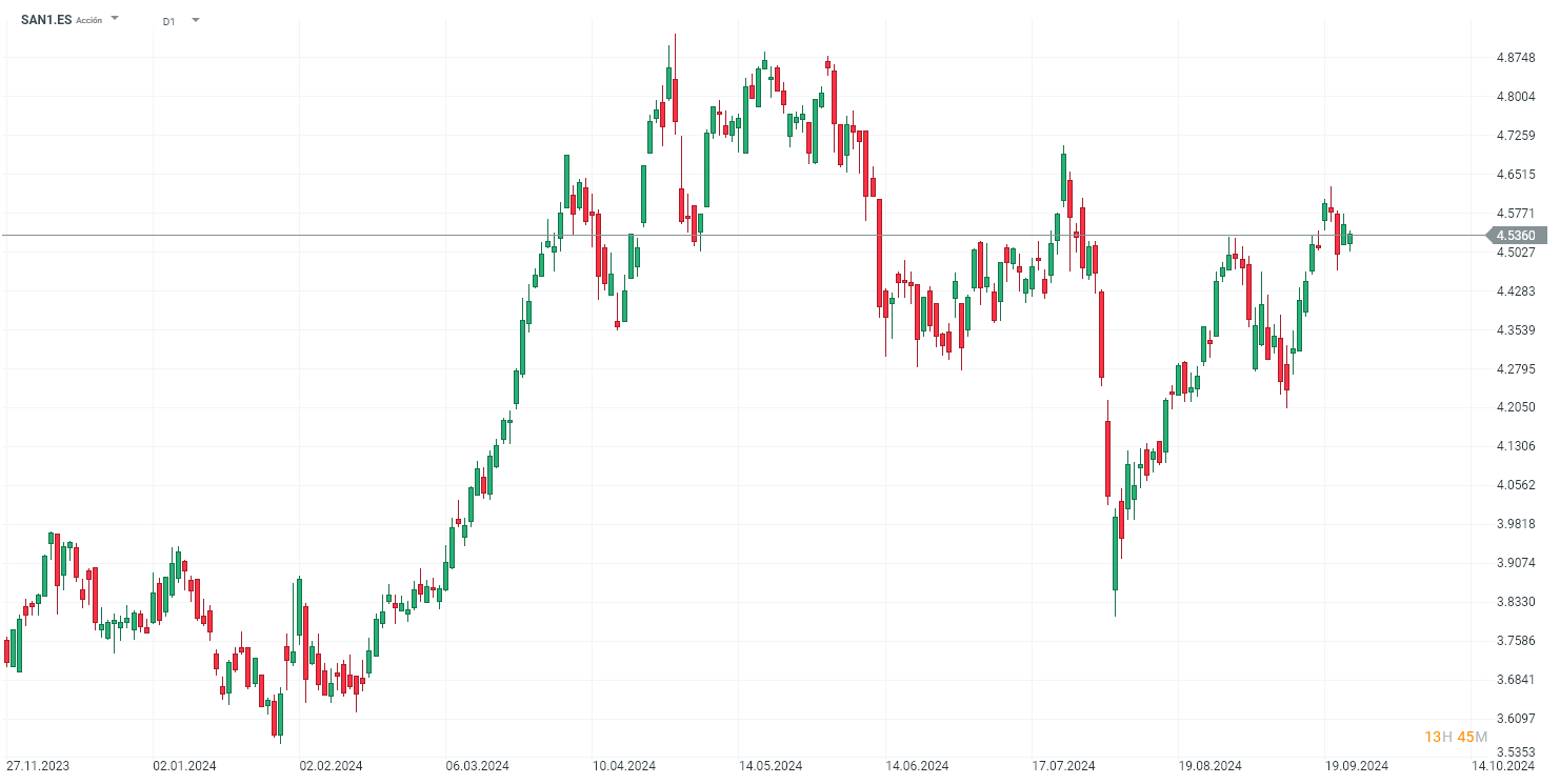 Las acciones del Banco Santander suben un 18% en este 2024, aunque han perdido fuerza y no han conseguido recuperar los niveles máximos alcanzados en mayo de este mismo año.