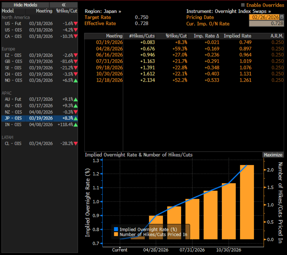 El gobernador del BOJ, Kazuo Ueda, confirmó que las reuniones de marzo (18–19) y abril (27–28) siguen “abiertas” a posibles subidas de tipos, dependiendo de las negociaciones salariales de primavera y de los datos económicos. La inflación de servicios en enero se mantuvo en el 2,6% interanual, apoyando las presiones de precios desde el mercado laboral y manteniendo el sesgo hacia nuevas subidas de tipos.