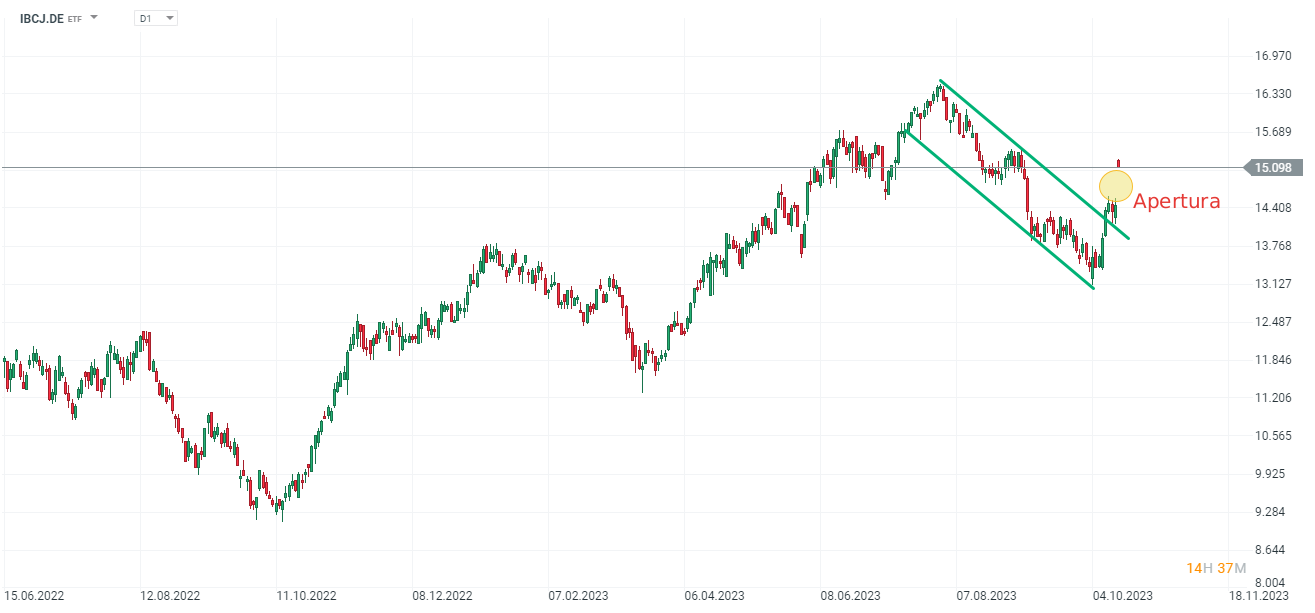 Gráfico del ETF IBCJ.DE mostrando el gap de apertura y la subida de la sesión de hoy. Fuente: Xstation 5