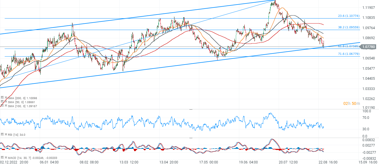 El eurodólar cotiza hoy cerca de una liquidación del 0,7% y está probando una línea de tendencia alcista después del discurso agresivo de Powell en Jackson Hole. Los datos de hoy según la Universidad de Michigan obtuvieron malos resultados y momentos después del discurso de Powell, Patrick Harker de la Reserva Federal habló sobre la economía.
