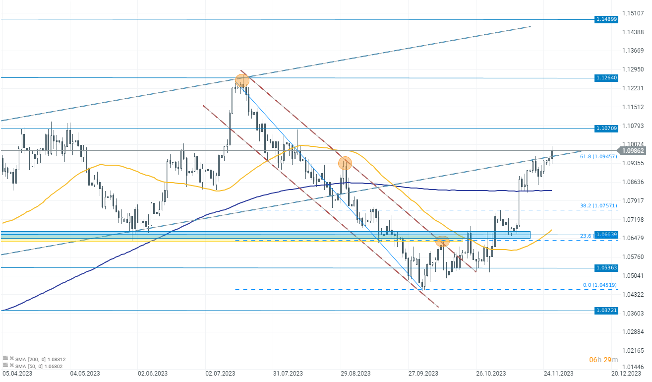El eurodolar supera una zona de resistencia clave alrededor de la convergencia del límite inferior del último canal ascendente y el retroceso de Fibonacci del 61,8% del último movimiento bajista (mediados de julio de 2023). Fuente: xStation 5