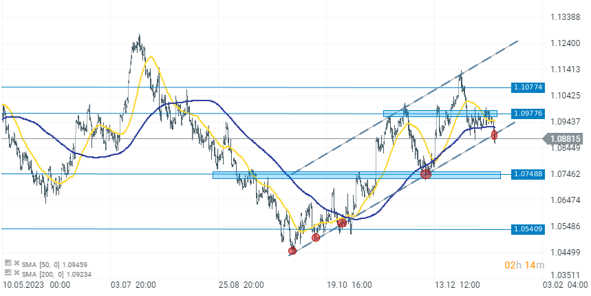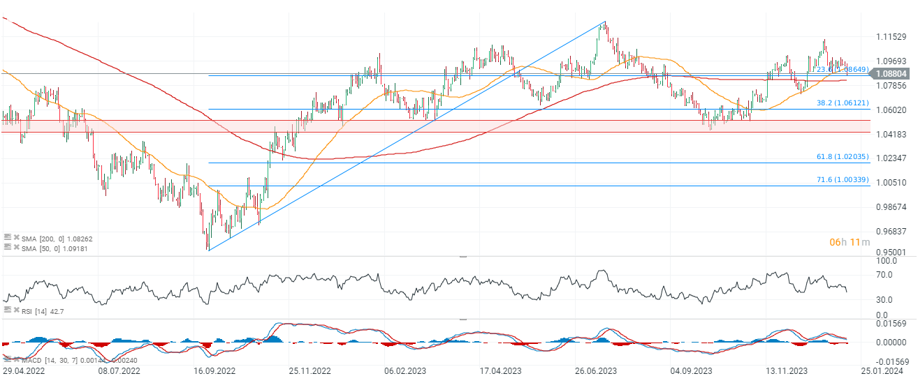 Intervalo D1: al observar el eurodólar en el gráfico D1, vemos que el par ha alcanzado un punto de soporte significativo, que es el retroceso de Fibonacci del 23,6% de la onda ascendente del otoño de 2022. Si se mantiene el nivel de 1,087, se producirá una continuación del Es posible una tendencia ascendente. Por otro lado, una caída por debajo de 1,087 podría indicar una prueba de la SMA200 (línea roja) y de los niveles alrededor de 1,06, en caso de que el soporte del retroceso de Fibonacci más cercano y la media móvil simple de 200 semanas resulten demasiado débiles para soportar la presión de venta. La zona clave a medio plazo parece estar alrededor del nivel 1,05 (horizontal, línea roja), por debajo del cual una ruptura podría incluso sugerir una nueva prueba de la paridad del eurodolar