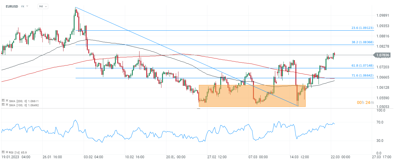 Las acciones de los bancos estadounidenses y europeos están borrando hoy algunas de las ganancias de ayer, y Rehn, del BCE, sugirió que EE. UU. debería realizar "pruebas de estrés" en los bancos medianos. El mercado aún ve a EE. UU. como el 'epicentro' potencial de la crisis bancaria, que debilita al dólar. Los reguladores de EE. UU. abandonaron las pruebas de estrés de los bancos regionales realizadas después de 2008, después de que la administración de Donald Trump derrogara la Ley Dodd-Frank en 2018. El dólar estadounidense está perdiendo terreno ante la perspectiva de riesgo sistémico y la Reserva Federal, se encuentra en una posición extremadamente difícil. Mirando el gráfico EURUSD en el intervalo H4, vemos que el par ha superado el SMA200 y el SMA100, así como el retroceso de Fibonacci de 61.8. Si la conferencia de Powell de hoy y la decisión de la Fed se perciben como moderadas, es probable que se pruebe el nivel de 1.083 donde vemos el retroceso de Fibonacci de 38.2.