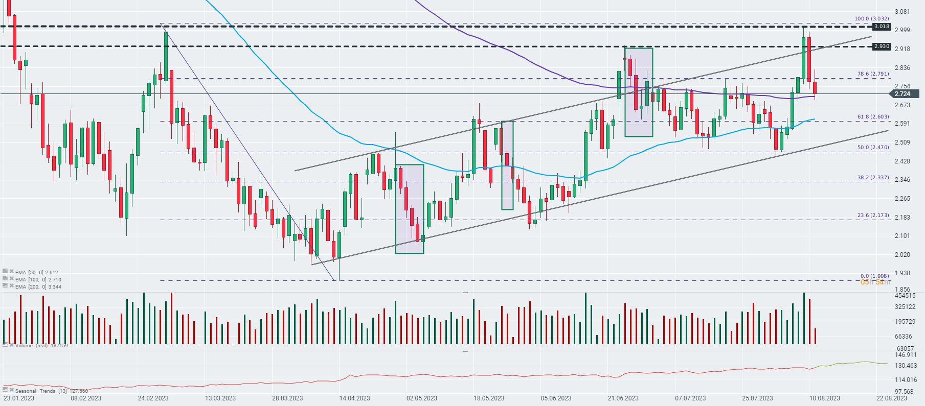 Actualmente, el Gas Natural está probando el soporte establecido por la media móvil exponencial de 100 días (curva morada). Fuente: xStation 5.