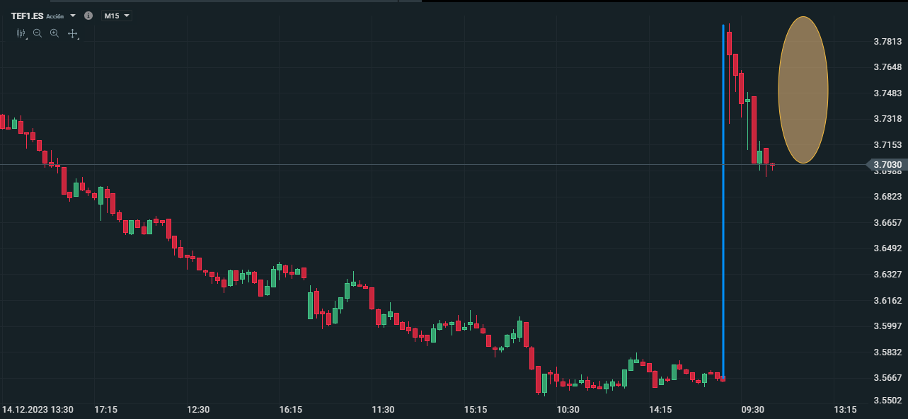 Mirando su cotización dentro del IBEX35, la apertura ha sido de casi un 7% al alza, pero las correciones bajistas posteriores la han llevado a fluctuar en los 3,7 euros actuales.