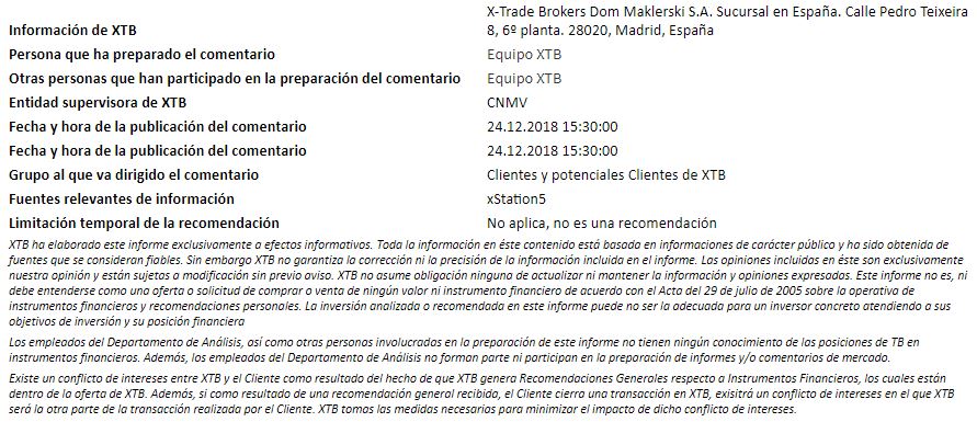 Las operaciones del viernes en Wall Street demostraron ser realmente sangrientas con el NASDAQ (US100) cayendo un 3% y marcando su peor semana desde la crisis financiera. Desde su punto máximo alcanzado en agosto, el índice de acciones tecnológicas cayó un 22%. Entrando en la zona bajista (un retroceso superio al 20% se considera bajista). Hay que tener en cuenta que durante los últimos meses, el NASDAQ perdió casi 3.000 millones de dólares en su valor de mercado, de donde 1.000 millones provinieron de FAANG (Facebook, Apple, Amazon, Netflix y Alphabet). El bajo rendimiento de las acciones mundiales es consecuencia de muchos factores, como la guerra comercial entre Estados Unidos y China, las preocupaciones sobre la desaceleración económica mundial, las tasas de interés más altas en los Estados Unidos y la agitación más reciente en la política estadounidense, así como las tensiones entre Trump y Powell. Los índices asiáticos se han mezclado hasta el momento con el Hang Seng (CHNComp) cayendo un 0,6% y el australiano S & P / ASX200 (AUS200) subiendo un 0,5%. El japonés NIKKEI está cerrado hoy. Vale la pena señalar que algunas noticias interesantes provienen de China. El Ministerio de Finanzas de China anunció que eliminará su arancel de exportación de mineral de hierro (y otros 93 productos) a partir del 1 de enero de 2019. Además, impondrá aranceles temporales sobre más de 700 artículos. Finalmente, los aranceles de importación sobre los bienes producidos en Macao y Hong Kong se eliminarán por completo. Sin embargo, los futuros del SP500 (US500) apuntan a una apertura en positivo. Sin embargo, debido la víspera de Navidad, muchas bolsas cerrarán más temprano, por lo que la liquidez será menor de lo normal.