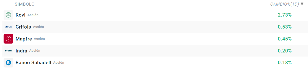 Las acciones de Rovi son las más alcistas del día de hoy, después de que se haya conocido que la empresa ha comprado una planta de producción en Phoenix a Bristol Myers, además de un acuerdo para seguir fabricando para la compañía americana durante 5 años. Las acciones de Grifols o de Mapfre siguen teniendo protagonismo en la jornada de hoy, al igual que lo tuvieron al comienzo de la sesión de ayer. El optimismo por la creación de la nueva comisión sigue latente en Grifols, mientras que Mapfre rompe máximos históricos.