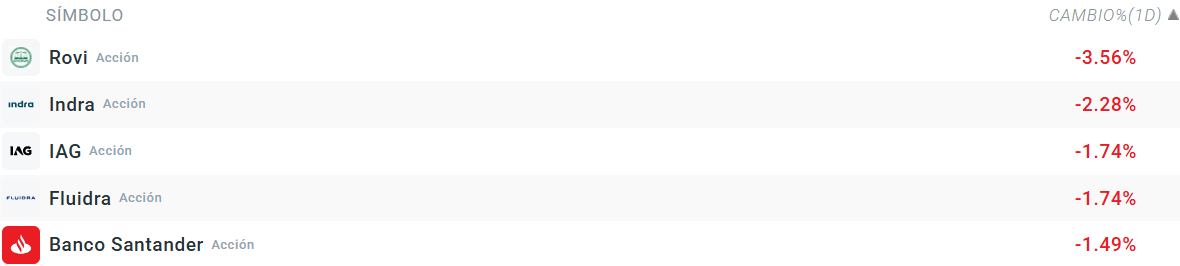 Las acciones de Rovi caen con fuerza después de que Jefferies le haya recortado su recomendación, a pesar de aumentar su precio objetivo. Este contraste se produce por el repunte de las acciones en este 2026. A la casa de análisis le preocupa la caída de los volúmenes de vacunación y la falta de visibilidad para su negocio de fabricación de terceros. Las acciones de Indra también caen, después de que Rheinmetall haya presentado unas cifras que se han quedado por debajo de lo esperado y con unas perspectivas que no han convencido al mercado. El sector defensa cotiza a múltiplos muy exigentes y esto pesa también sobre Indra, aunque su valoración no sea tan alta como la del resto de compañías especializadas. IAG también cae, aunque viene de una sesión en la que se anotó fuertes repuntes.