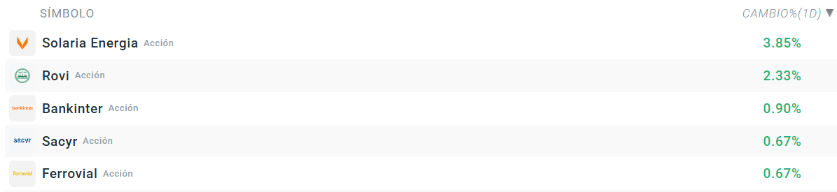 Las acciones de Solaria siguen de dulce después de la presentación de resultados de ayer en la que consiguió un incremento de sus ingresos del 59%. Esto está alimentando posiblemente el cierre de cortos, ya que las cifras de la compañía se siguen beneficiando de un precio de la electricidad con respecto al año pasado. Rovi también continúa al alza después de la noticia de ayer sobre la compra de una planta en Estados Unidos. En definitiva, las compañías que están en verde hoy son las que ayer ya tuvieron una buena jornada.