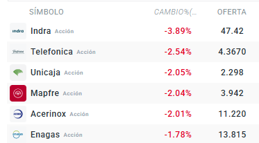 Indra lidera las caídas del Ibex 35, tras generar dudas entre los inversores por el incremento de inversión en su nueva división, IndraMind. Por su parte, Telefónica también sufre una importante corrección (-2,54%) tras anunciar un recorte de dividendo que rompe con su política de retribución habitual al accionista. Esta rebaja del dividendo de la "teleco" española es la cuarta en los últimos 30 años. Por su parte, el sector financiero sufre tras presentar resultados. Unicaja retrocede un 2,05%, y Mapfre prácticamente lo mismo tras anunciar un inesperado dividendo en su presentación hace tan sólo unos minutos.