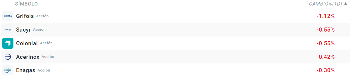 Las acciones de Grifols son las que peor comportamiento están teniendo en el Ibex 35 y se anotan caídas de más del 1%, a pesar de que no hemos conocido noticias de la empresa. Sacyr o Colonial también se cuelan en la parte baja. Sin embargo, no hay grandes caídas a destacar.
