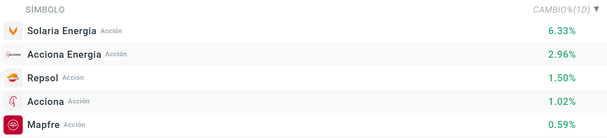 En la parte alta del Ibex 35 las acciones de Solaria son las que más destacan, con subidas de más del 6%. Los alcistas siguen presionando a los inversores en corto, a medida que otras casas de análisis se van sumando al optimismo y suben su recomendación para la compañía. Por otro lado, las acciones de Acciona Energía también repuntan y se animan a medida que avanza la sesión. Normalmente estas acciones se mueven juntas al alza cuando hay alguna noticia positiva para el sector por las políticas de Trump, pero hoy no parece ser el caso. Acciona o Repsol le siguen de cerca.