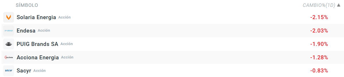 Las acciones de Solaria son las que más caen, con un descenso de algo más del 2% después de que ayer sufriera caídas del 1,7% a pesar de que la jornada la empezó al alza. Las subidas del lunes fueron del 15% y es normal ver corrección después de subidas verticales. Por su lado, Endesa sufrió ayer un recorte de precio objetivo y a pesar de los descensos de ayer hoy también achaca el impacto. Mientras, Puig está cayendo un 2% a pesar de que la perspectiva para el sector había mejorado, ubicándose de nuevo por debajo de los 14€ por acción.