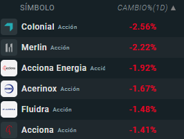 En la parte bajista del Ibex35, las constructoras y utilities descuentan las caídas con mayor severidad, dado que podrían aumentar sus líneas de crédito en un entorno macroeconómico complejo en la economía mundial. Por otro lado, estas empresas tienen un catalizador en el horizonte, al ser las que tienen programadas su presentación de resultados esta misma semana : Colonial, Acciona y Acciona energía (jueves) y Merlín (viernes).
