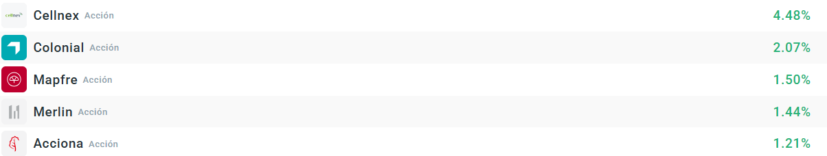Las subidas del Ibex35 están protagonizadas por Cellnex, que se anota subidas de más de un 4% por un nuevo plan de recompra de acciones que rondaba el 4% de la capitalización bursátil antes del anuncio. Por su parte, las socimis siguen arrastrando la mejora de recomendación de varias casas de análisis que conocimos ayer.