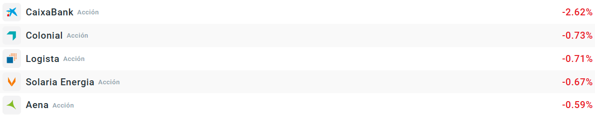 La parte baja del Ibex35 la copa CaixaBank, aunque como ya dijimos ayer hoy está descontando dividendo, por lo que entra dentro de lo normal. El resto de empresas que caen no siguen un patrón concreto. De hecho, hay bastante movimiento, a pesar de que tampoco hay caídas destacadas.