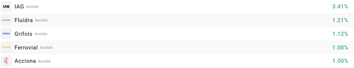 En la parte alcista del Ibex35 volvemos a ver las acciones de IAG, que suben más de un 3%. La aerolínea rebota un 8% después de una caída del 11%, que aún no ha recuperado. En general, el consenso es bastante optimista para IAG. Fluidra y Grifols también suben más de un 1% y comienzan la sesión con fuerza.