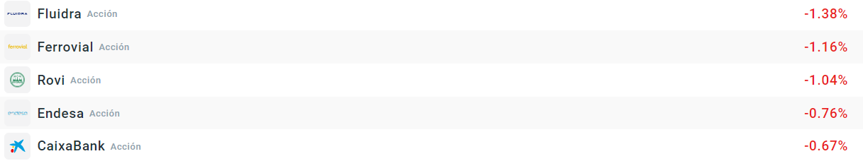 Las caídas están protagonizadas por Fluidra, aunque parece una corrección de las subidas de ayer. Destaca de nuevo Rovi, que ayer fue la que peor desempeño tuvo y esta mañana sigue con mal comportamiento.