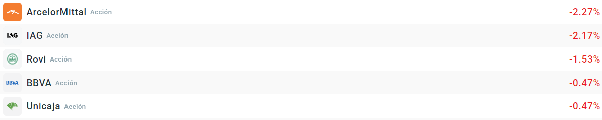 Por ese mismo motivo caen las acciones de ArcelorMittal, que tiene la mayoría de sus plantas en Canadá y que se verá afectada por el arancel. Las acciones de IAG caen por la bajada de recomendación de Goldman Sachs desde "sobreponderar" hasta "neutral" a pesar de la subida de precio objetivo. La banca también se anota caídas después de una gran semana pasada.