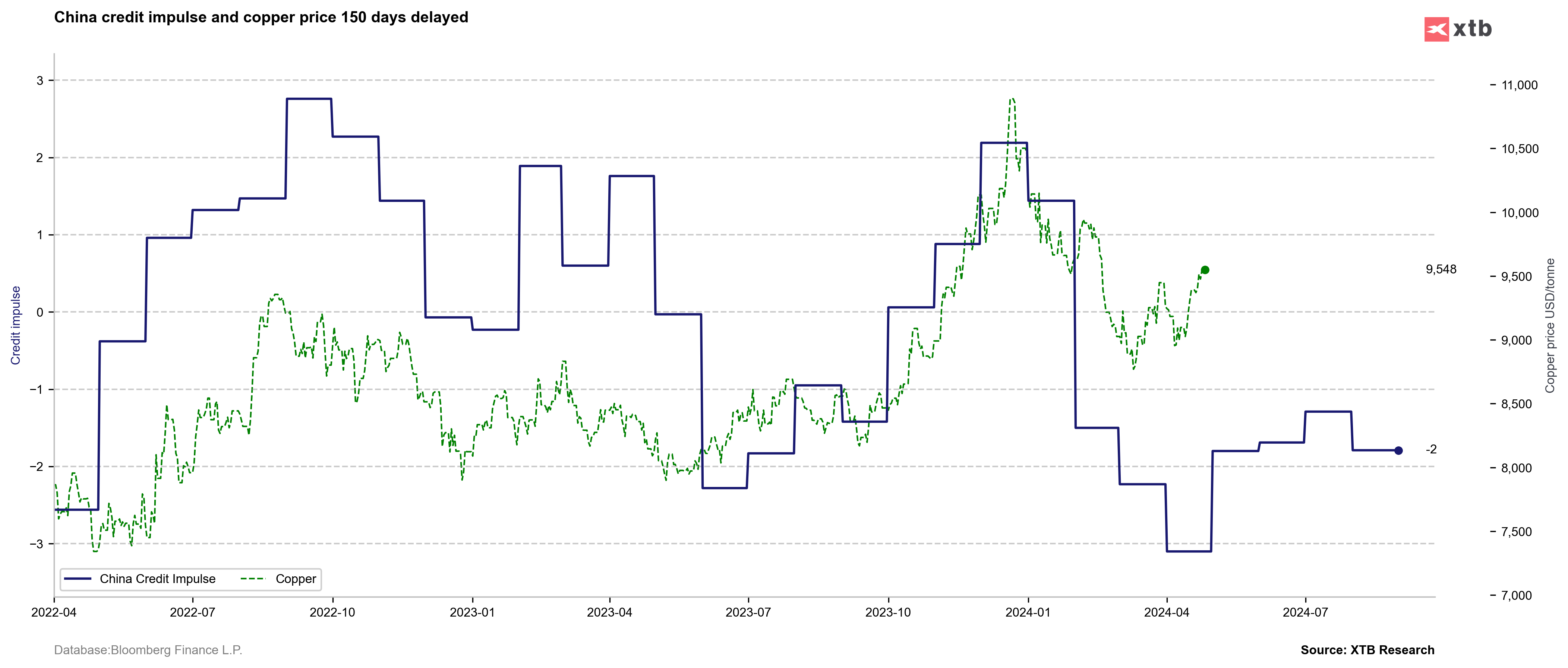 Impulso crediticio en China (azul) y precios del cobre (verde). Fuente: Bloomberg Finance L.P.
