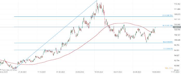 Si observamos el gráfico de contratos del índice del dólar en el intervalo D1, vemos que el precio se acerca a una zona de resistencia clave en 105,1 puntos (38,2 abolición de la onda alcista de 2021). Una potencial superación de los 105 pts podría abrir el camino a los 108 pts o iniciar un movimiento correctivo hacia la zona de la media de 200 sesiones, cerca de los 103 pts.