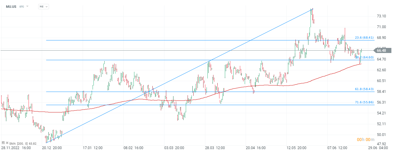 Acciones de Micron (MU.US), intervalo H4. El precio respetó el soporte SMA200 (línea roja) durante la última corrección, pero potencialmente un informe por debajo de las expectativas podría indicar una caída por debajo de 63 $, lo que podría conducir a una prueba del retroceso de Fibonacci 61.8% de la ola alcista de diciembre de 2022, a 58 % por acción. Podemos encontrar la resistencia más cercana en 68 $ (zona de retroceso de 38,2% Fibonacci). Fuente: xStation5