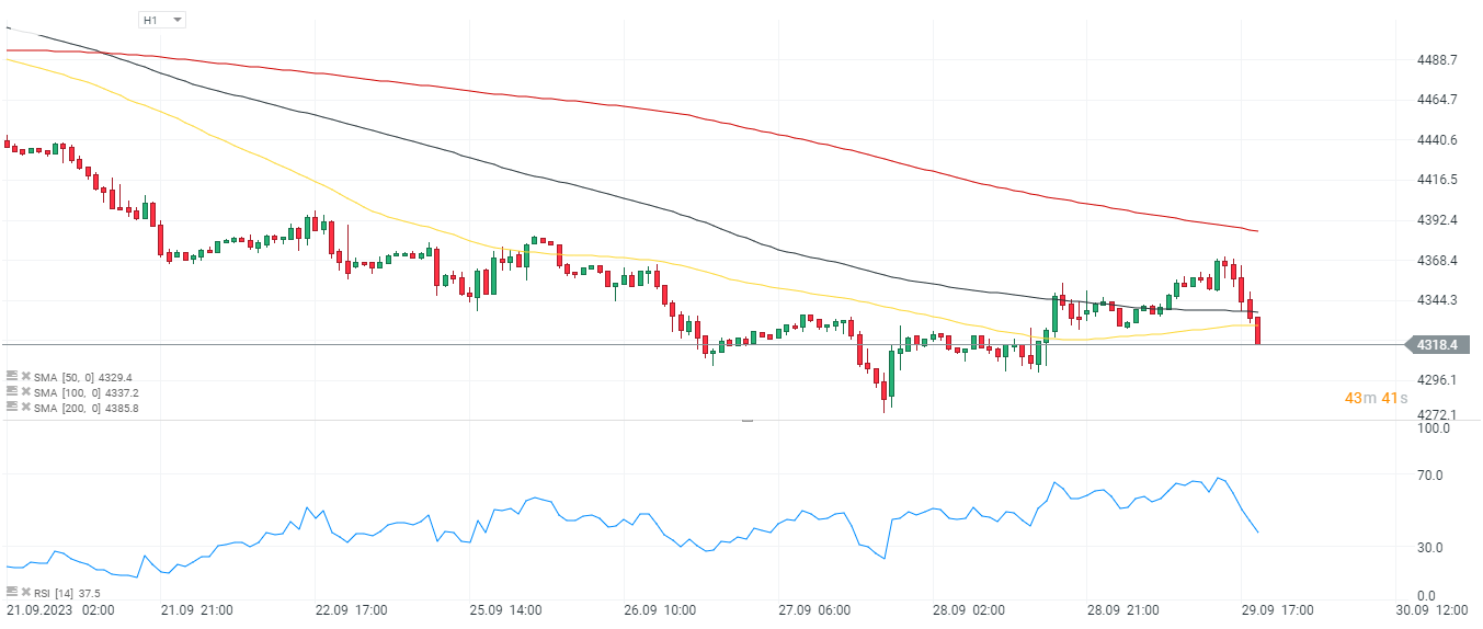 El S&P 500 ha reducido casi completamente sus subidas y se está negociando bajo una fuerte presión de venta, con el precio estableciéndose por debajo de la SMA de 50 y la SMA de 100 en el intervalo H1. Los futuros del índice están perdiendo un 0.54%.