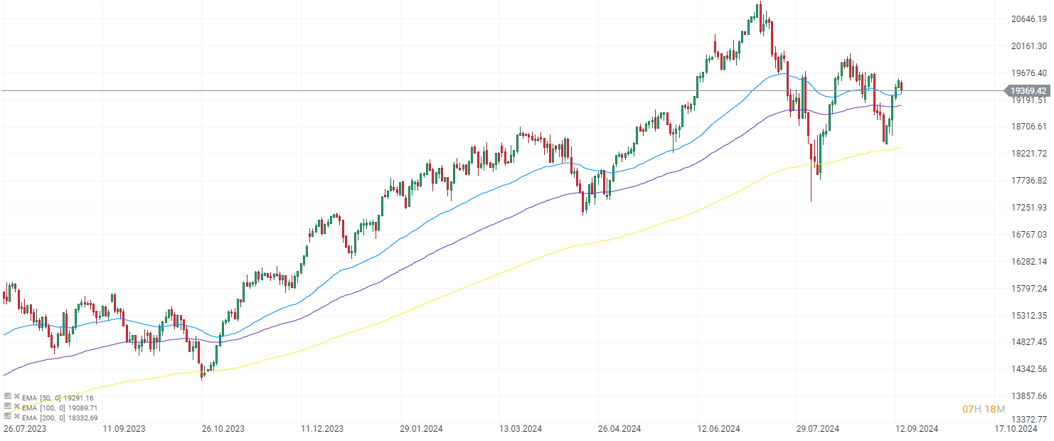 El índice Nasdaq 100 cotiza hoy un 0,51% por debajo del cierre del viernes. Sin embargo, cabe señalar que las subidas de la semana pasada hicieron que el índice superara la zona de resistencia, que era la media móvil exponencial de 50 días (curva azul en el gráfico). El mantenimiento de esta zona a medio plazo podría ser un elemento importante que defina el retorno sostenido del Nasdaq 100 a la tendencia alcista. En cambio, a medio plazo, un punto de apoyo importante puede ser la zona psicológica cerca de las EMA de 100 y 200 días (curva violeta y curva dorada). La zona puesta a prueba repetidamente por la demanda y la oferta cerca de los 19.740 puntos puede considerarse ahora como una resistencia clave.