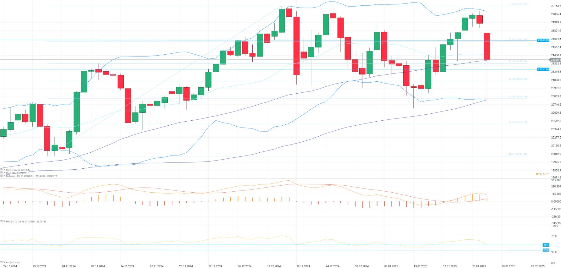 El índice Nasdaq 100 ha caído por debajo de los niveles de soporte clave: el nivel de retroceso de Fibonacci del 23,6%, que se alinea con el máximo de principios de diciembre de 21.668, la media móvil simple (SMA) de 50 días en 21.370 y el nivel de retroceso de Fibonacci del 38,2%. Estos niveles actuarán ahora como resistencia para los alcistas que intenten un rebote.
