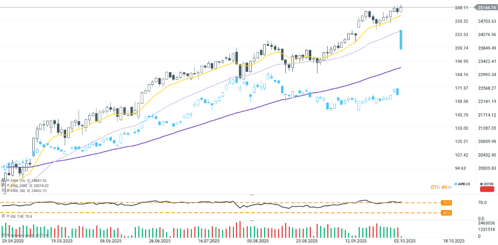 La jornada de hoy se ve condicionada por las turbulencias políticas en Francia y Japón, que alteran el sentimiento en los mercados globales. Las acciones japonesas alcanzaron un nuevo máximo histórico tras la salida de Sanae Takaichi, con una política fiscal y monetaria laxa, del Partido Liberal Democrático. Las acciones de semiconductores lideran la sesión, ya que la colaboración multianual de AMD con OpenAI refuerza la narrativa de crecimiento impulsada por la IA, en línea con los informes más recientes de ISM, que muestran una demanda constante de IA y soluciones en la nube. Otras acciones destacadas del sector como TSMC (TSM.US: +4,8%) e Intel (INTC.US: +4,4%) también suben con fuerza. Por otro lado, las acciones de bienes raíces y bienes de consumo están lastrando la confianza general del mercado.