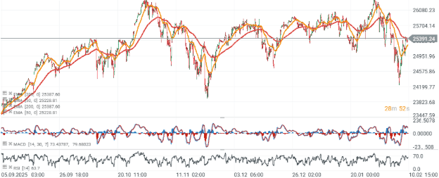 El Nasdaq 100 cotiza por encima de la EMA 200 (línea roja) y se sitúa a unos 1.000 puntos del máximo histórico cerca de 26.400.