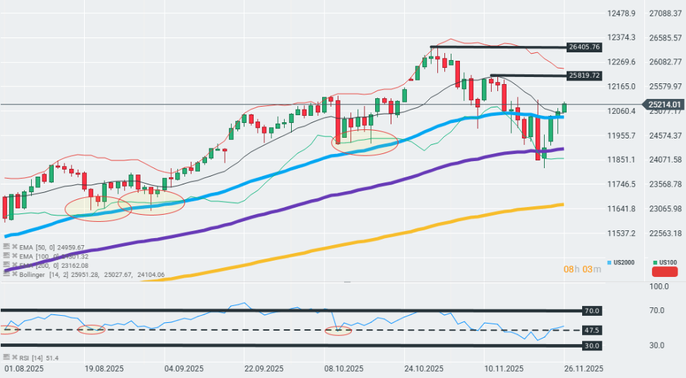 El sentimiento inicial en Wall Street en la sesión previa al día de Acción de Gracias es positivo. El Nasdaq 100 avanza un 0,4% debido a las crecientes probabilidades de recortes en diciembre y al optimismo generado por las conversaciones de paz entre Ucrania y Rusia. En contraste, las acciones de Alphabet corrigen en estos momentos debido a la recogida de beneficios tras las recientes subidas por los avances en tecnología de inteligencia artificial de la compañía. Por su parte, las acciones de Nvidia repuntan un 1% en estos momentos.