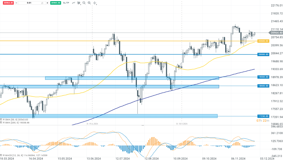 El Nasdaq 100 lidera las subidas entre los índices de Wall Street y se acerca nuevamente al nivel de los 21.000 dólares. La reciente corrección se detuvo en el rango de 20.500-20.600 puntos. La siguiente cota a alcanzar, que está actuando de resistencia psicológica son los 21.000 puntos.