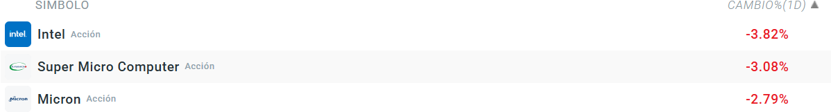 Esto está afectando a otras acciones como Intel, que se dejan más de un 3% y a medida que avanza la sesión el castigo es mayor, descendiendo posiciones en el Nasdaq 100.