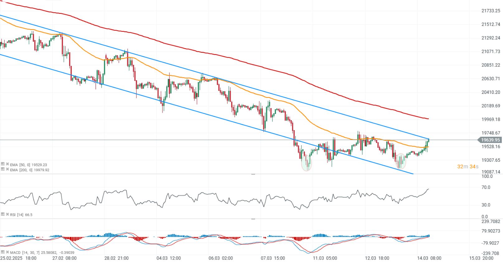 Los índices de Wall Street, sobre todo el Nasdaq 100, repuntan ante la mejora del sentimiento en las acciones de "las Magníficas 7" y en sectores con fuerte componente tecnológico como semiconductores y software. A pesar de un informe de la Universidad de Michigan mucho más débil de lo esperado, que indica un aumento de las expectativas de inflación y una caída de las expectativas de los consumidores, los alcistas siguen comprando acciones estadounidenses. Nvidia sube casi un 5%, impulsando al alza acciones de IA como AppLovin (APP.US) y Palantir (PLTR.US). Como se puede ver a continuación, el Nasdaq 100 intenta superar el canal de precios descendente, con la importante zona de oferta en los 19 640 puntos. La subida por encima de los 19 700 puntos podría abrir el camino hacia un nuevo intento de superar los 20 000 puntos.