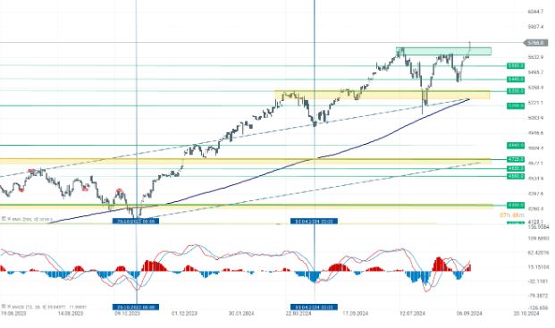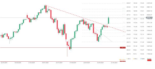 El rollover fue de aproximadamente 50 puntos. Incluso sin el vuelco, el US500 estaría en nuevos máximos históricos. Ayer vimos una toma de ganancias después de la conferencia de la Fed, pero hoy estamos viendo una continuación del fuerte repunte que comenzó el 9 de septiembre. La zona de soporte clave sigue estando alrededor de 5.670-5.700 puntos. Los niveles de resistencia incluyen 5.805 en el retroceso de Fibonacci de 113,0 y 5.900 en el retroceso de Fibonacci de 127,2. En este nivel, también encontraremos el rango de la onda ascendente anterior.