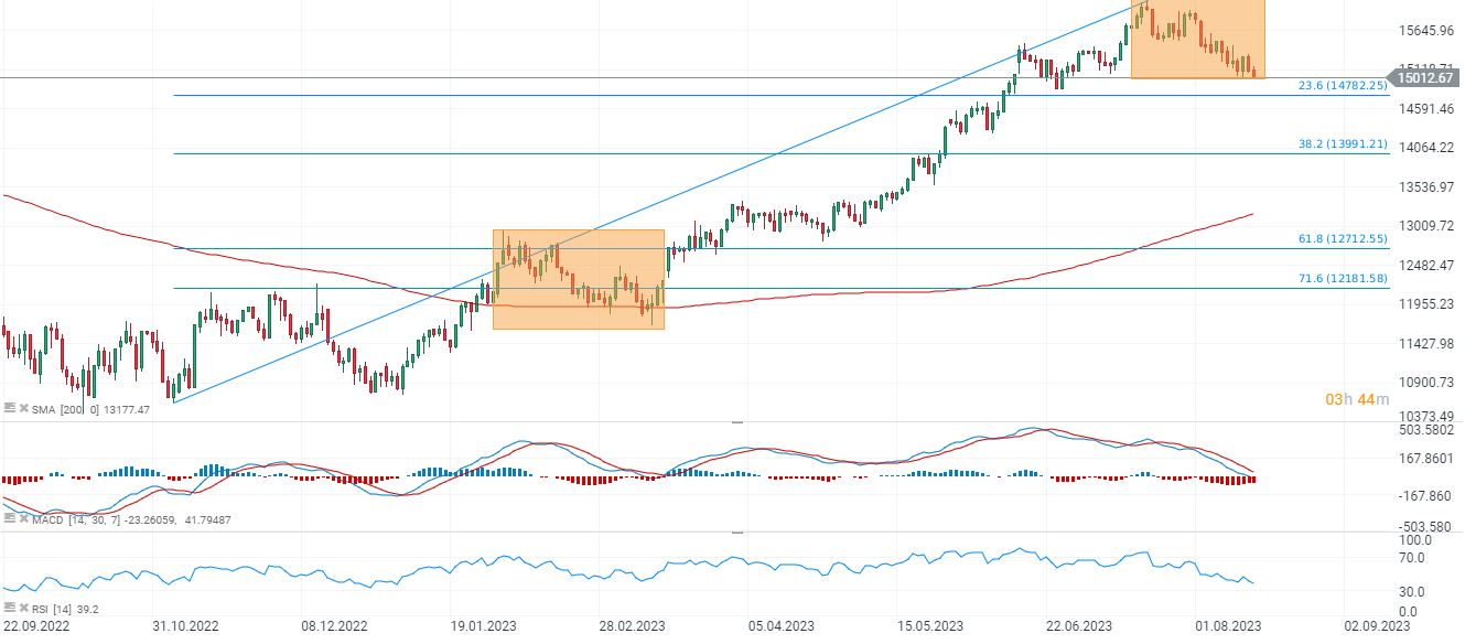 Al observar el gráfico del índice Nasdaq en el intervalo D1, podemos ver que una batalla importante por el impulso alcista para el resto del año podría desarrollarse en los niveles actuales. El rango potencial de la corrección es de alrededor de 14,700 puntos, donde vemos el retroceso de Fibonacci del 23.6%, pero para los alcistas podría ser importante mantener el nivel psicológico de 15,000 puntos. Fuente: xStation5.
