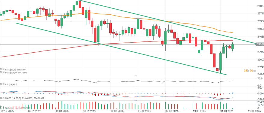 Los futuros del Nasdaq 100 han limitado la presión bajista hasta ahora, pero la próxima prueba clave para los inversores será el plazo fijado por Trump para alcanzar un acuerdo con Irán. Desde el punto de vista técnico, los futuros del Nasdaq 100 siguen dentro de un canal bajista y continúan cotizando por debajo de la media móvil de 200 sesiones, situada aproximadamente 200 puntos por encima.