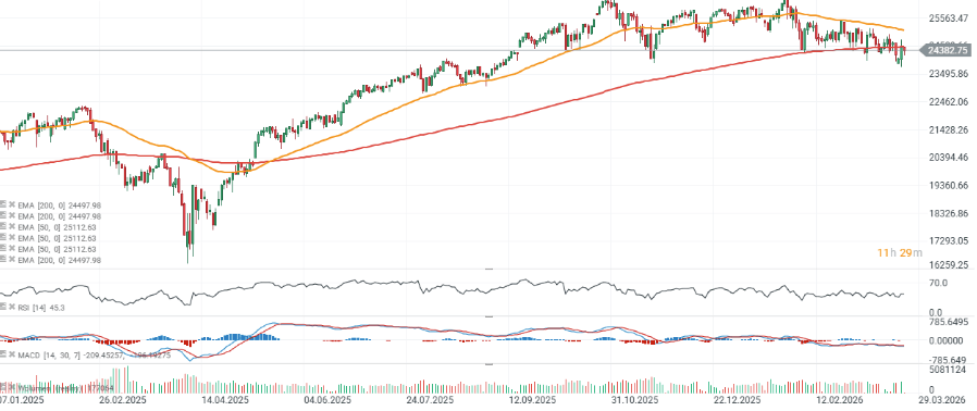 La perspectiva técnica parece estar deteriorándose. Si los compradores no logran impulsar el índice por encima de la EMA de 200 sesiones (línea roja, 24.500 puntos), la presión vendedora podría aumentar, arrastrando potencialmente al índice hacia el nivel de 23.000 puntos.