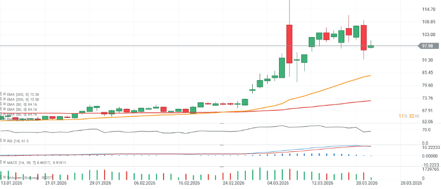 El petróleo se enfrió significativamente ayer y ahora intenta volver a situarse por encima de los 100 dólares por barril. El RSI se sitúa en 61 y se relajó notablemente durante la sesión anterior. Los niveles clave de soporte a largo plazo se encuentran en 91 dólares —definido por reacciones recientes del precio— así como en 84 y 72 dólares (las medias móviles EMA50 y EMA200).