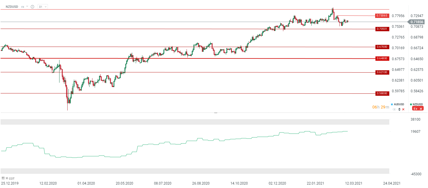 El NZDUSD está un poco peor desde finales de febrero. Obviamente, este es el efecto del aumento del dólar estadounidense relacionado con el fuerte aumento de los rendimientos. Como se puede ver, el pico del precio de la leche también ha coincidido con el máximo local del NZDUSD en torno a 0,7300. Fuente: xStation5