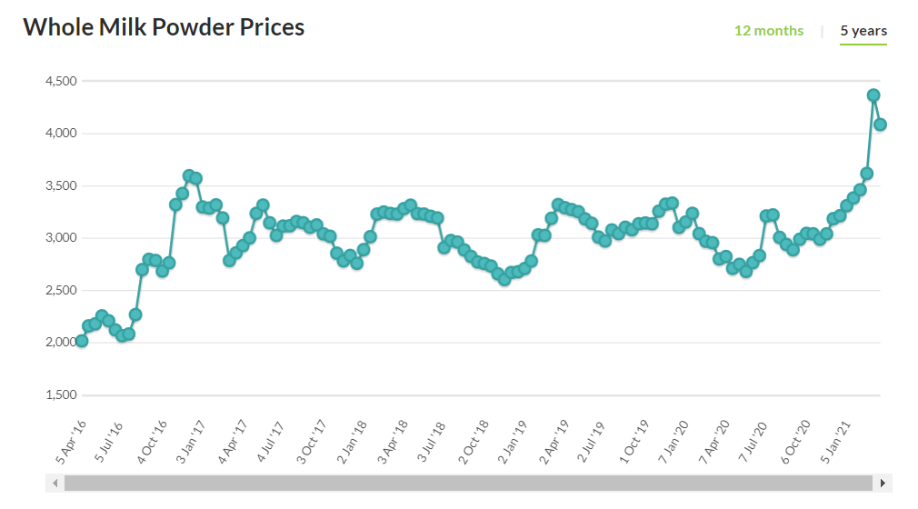 El precio de la leche en polvo es el que más baja, más del 6%. Sin embargo, los precios se mantienen por encima de los 4.000 dólares por tonelada. Fuente: GDT