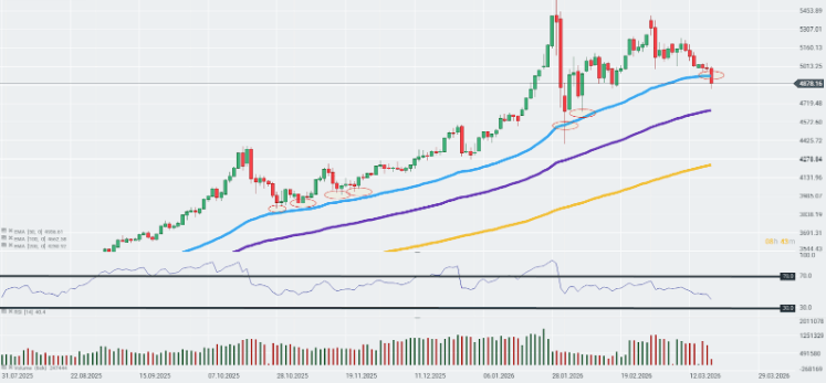 El precio del oro ha caído un 2,5% por debajo del nivel de 4.900 dólares, marcando un descenso de más del 12% desde el máximo histórico alcanzado en enero. La caída se ha acelerado durante la sesión de hoy, impulsada por nuevas preocupaciones sobre la situación en Oriente Medio tras los ataques a instalaciones industriales en Asaluyeh.