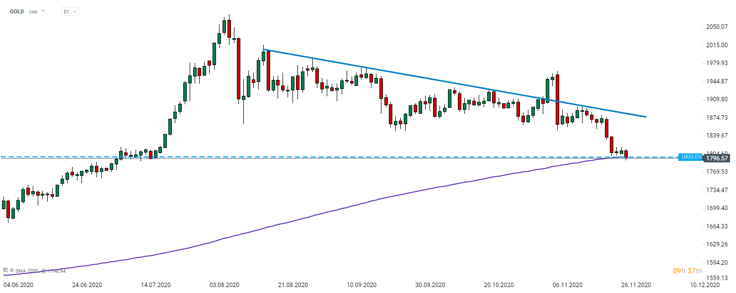 El precio del oro cae por debajo de $ 1,800 por primera vez desde mediados de julio de 2020 y prueba la media mobil de 200 sesiones. Fuente: xStation5