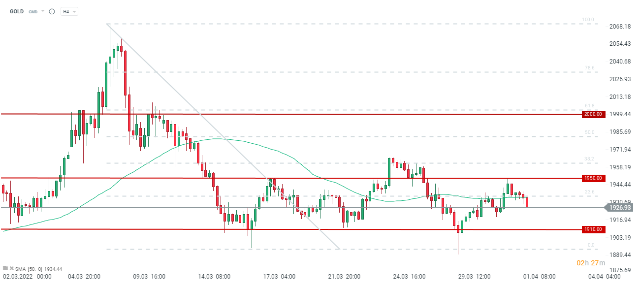 El oro es una de las materias primas más volátiles en la actualidad y cae casi un 1 % antes de la publicación de los datos de las NFP. Los mercados están relativamente tranquilos hoy a pesar de que los rusos dicen que la base para las conversaciones de paz disminuyó después de que Ucrania supuestamente atacara los depósitos de combustible en Rusia. El dólar estadounidense ganó ayer debido a la incertidumbre relacionada con la guerra y reanudó el repunte de los rendimientos. Los rendimientos más altos y el USD más fuerte están ejerciendo presión sobre los precios del oro hoy. Sin embargo, la publicación de NFP podría ser un motor tanto para el USD como para el oro. El mercado espera que el informe de hoy muestre un aumento de 475.000 puestos de trabajo en marzo, más o menos en línea con los 455.000 señalados por los datos API a principios de esta semana. Sin embargo, cabe señalar que las sólidas lecturas de los subíndices regionales de empleo aumentan las posibilidades de una sorpresa positiva. Los inversores deben tener en cuenta que los datos de NFP tienden a ser volátiles y, dado el contexto fundamental actual, es poco probable que incluso un gran error desaliente a la Fed de subir los tipos en 50 puntos básicos. También se espera que el crecimiento de los salarios se acelere hasta el 5,5 % interanual, tras una desaceleración del 5,7 al 5,1 % interanual en febrero.