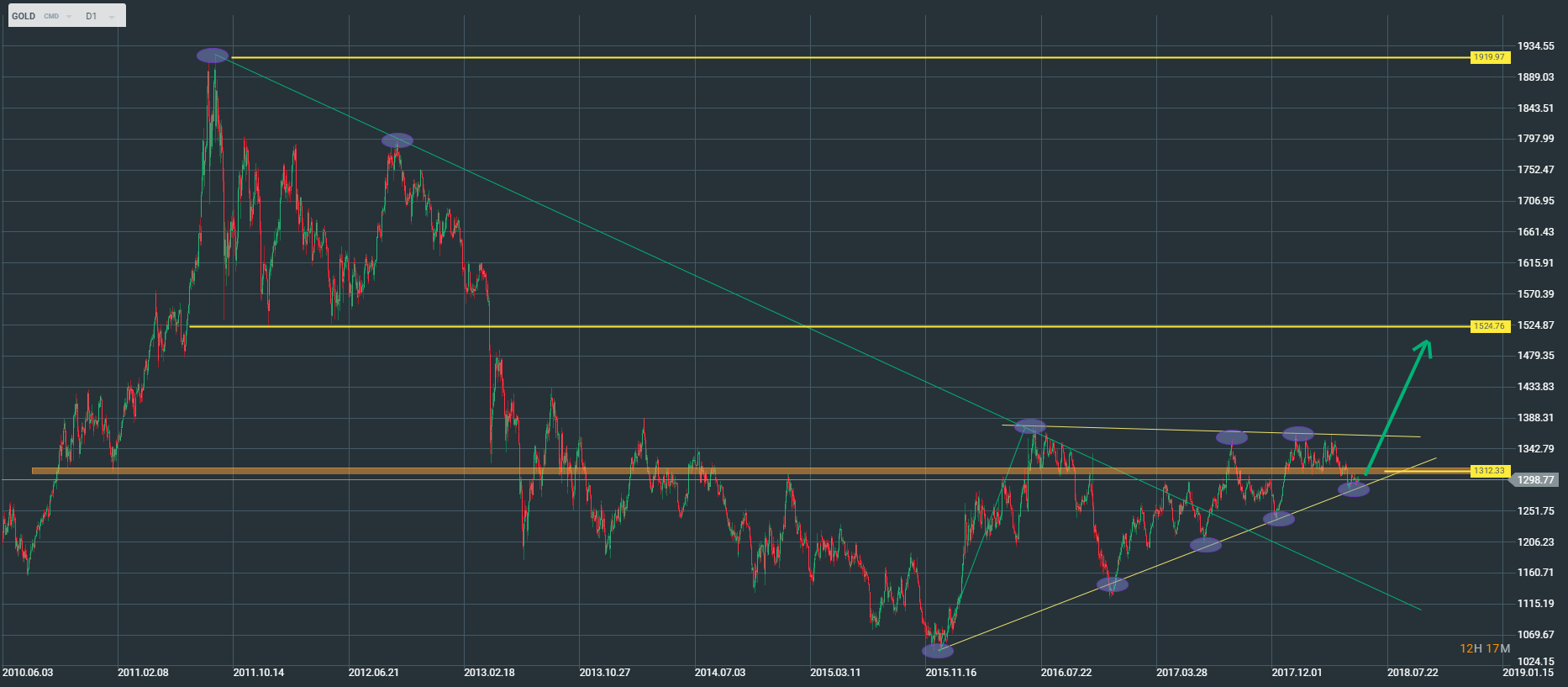 Actualmente nos encontramos en la parte baja de la tendencia. Podemos observar como el precio está dibujando una formación de triangulo, con una estructura de máximos y mínimos crecientes. Esta figura suele ser una continuación de tendencia. El metal amarillo se encuentra ante una resistencia clave. La ruptura de los 1.312 puede ser clave para iniciar una tendencia a medio largo plazo y buscar el antiguo soporte de los 1.524 dólares. Los niveles actuales de cotización del oro son una oportunidad de inversión tanto a largo como a corto plazo siendo ambas tendencias positivas