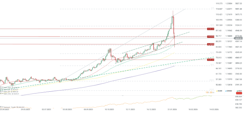 Un cierre diario del precio del oro por encima de 4.750 dólares por onza podría indicar que la corrección en el mercado del oro ha concluido. En ese escenario, el objetivo sería un rápido retorno hacia la barrera psicológica de los 5.000 dólares. Por el contrario, si el oro cierra la sesión más cerca de 4.500 dólares, la posibilidad de una corrección más profunda sigue sobre la mesa. Esto podría llevar los precios hacia la línea de tendencia de largo plazo, situada en el rango de 4.000–4.200 dólares por onza.