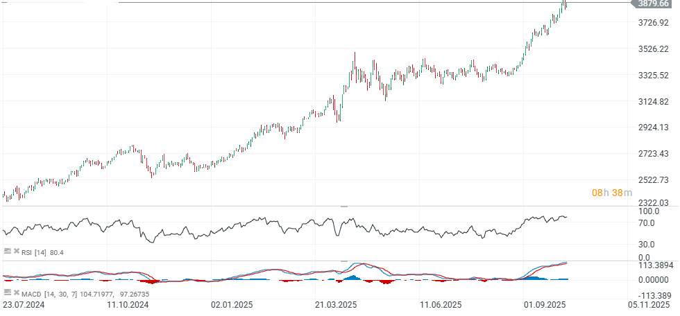 Como resultado, el oro continúa su fuerte repunte, acercándose a los 3.900 dólares por onza. El RSI en el gráfico diario ha superado los 80, alineándose con varios picos locales previos en el precio del metal.